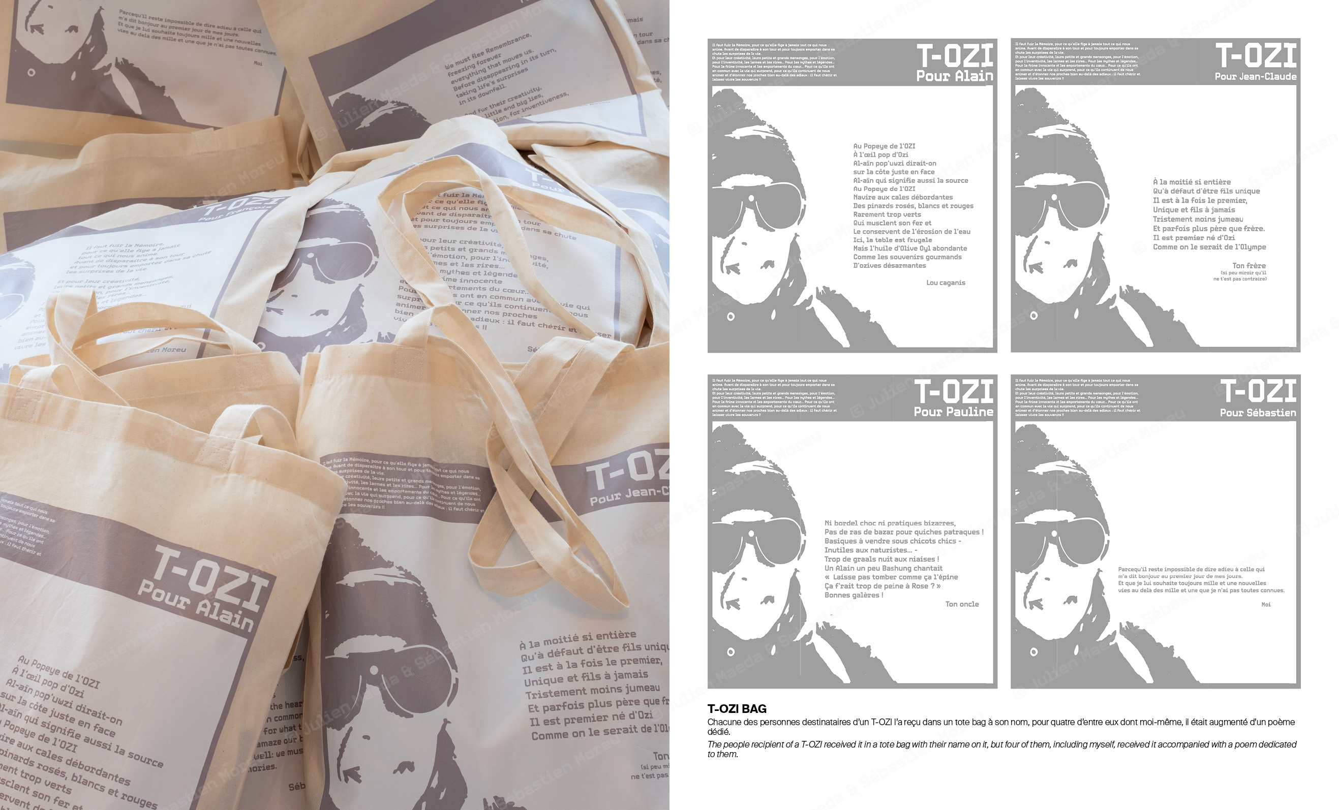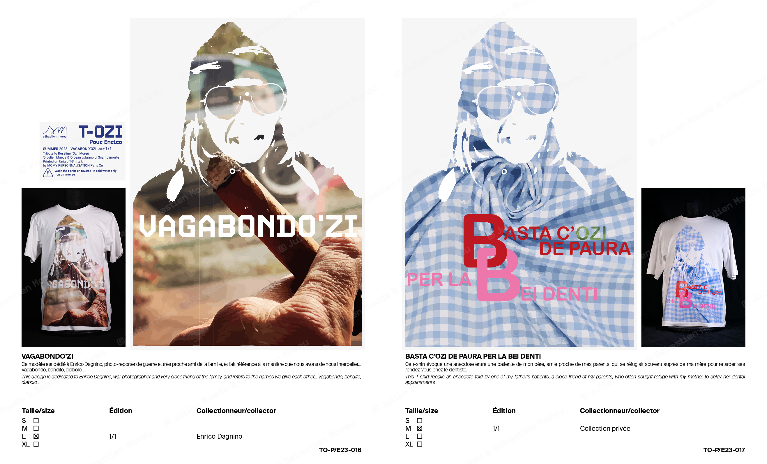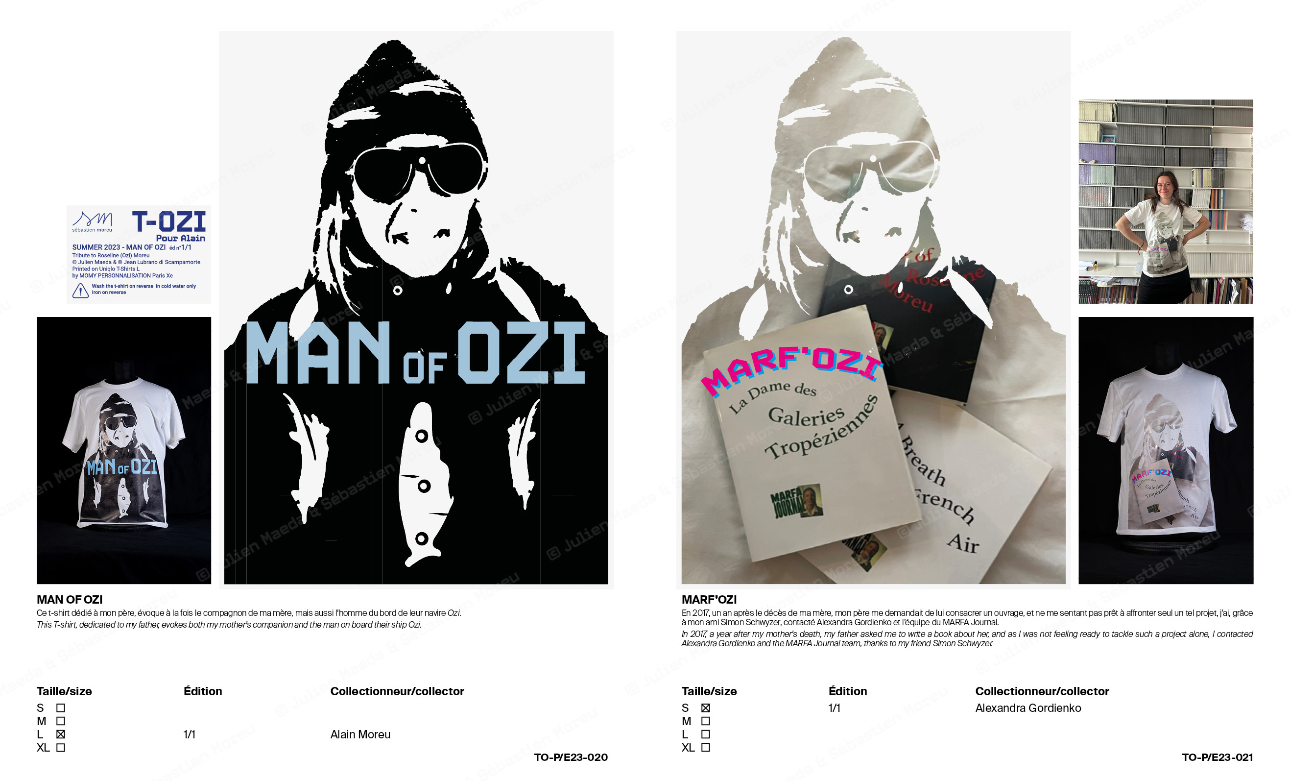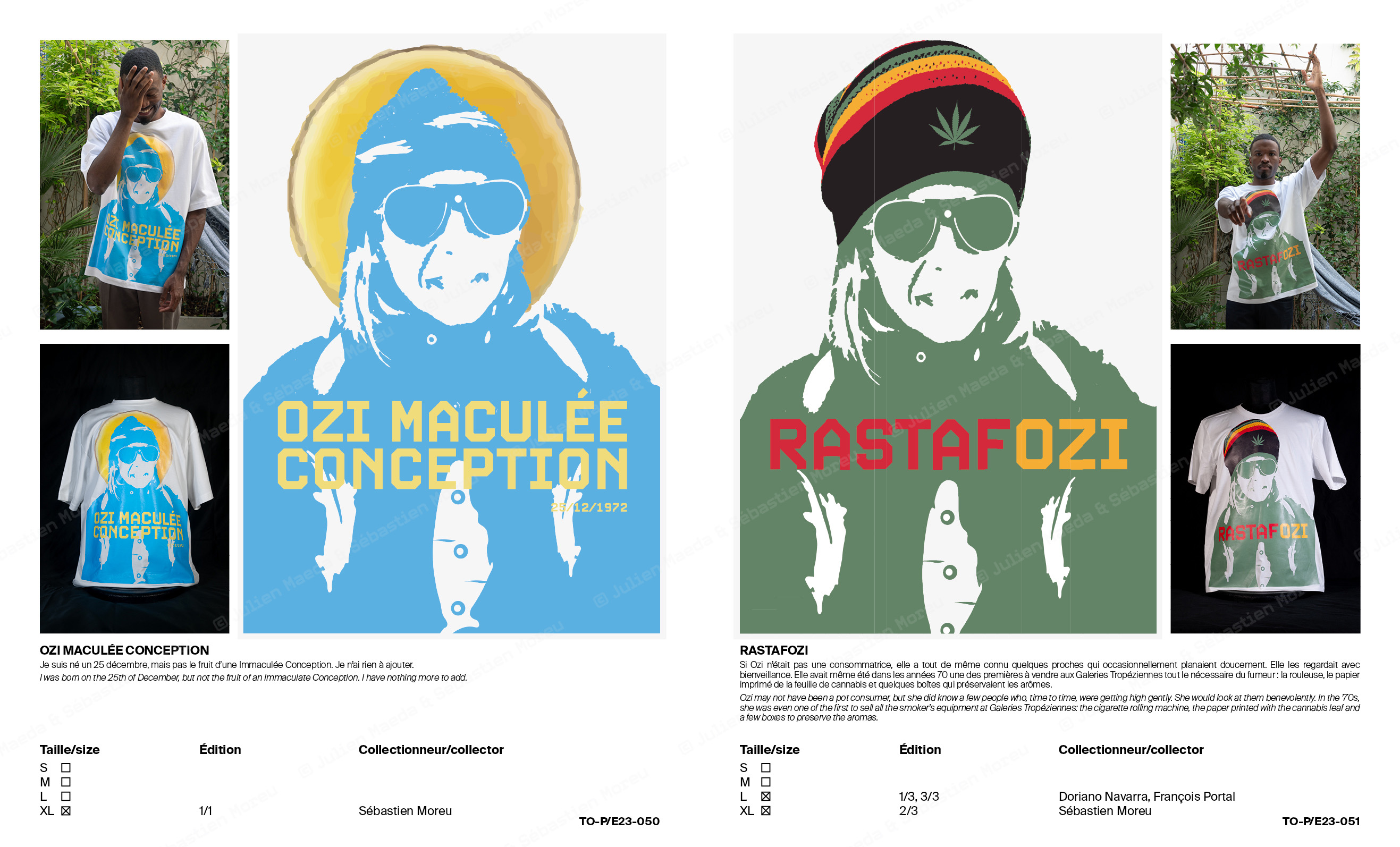 L’ouvrage T-OZI® COLLECTION de 68 pages documente et prolonge le concept en se présentant sous la forme d’un catalogue de représentant de commerce d’une marque de prêt-à-porter, qui bien que déposée est totalement fictionnelle. Des notices expliquant chacune des variations ainsi qu’un texte de Sébastien Moreu ponctuent les reproductions et prises de vue.