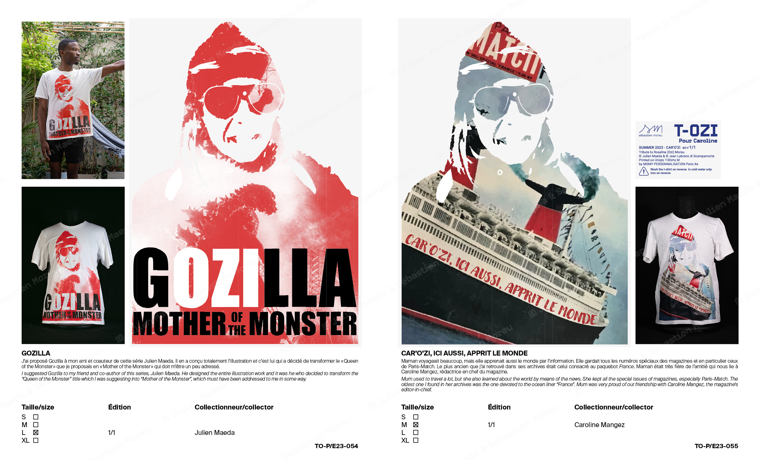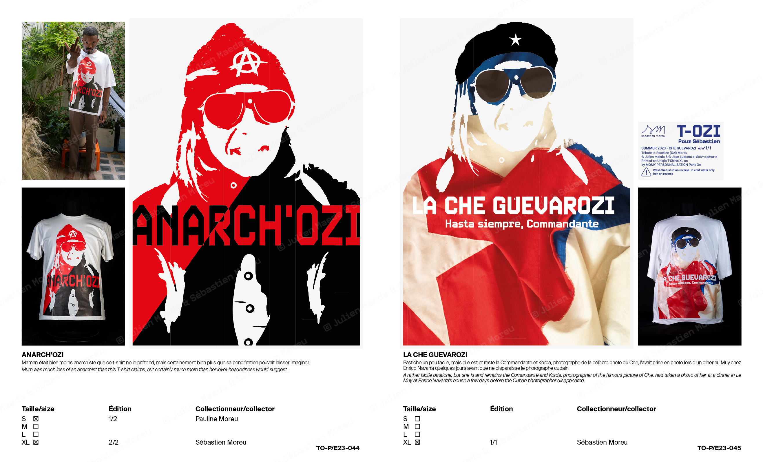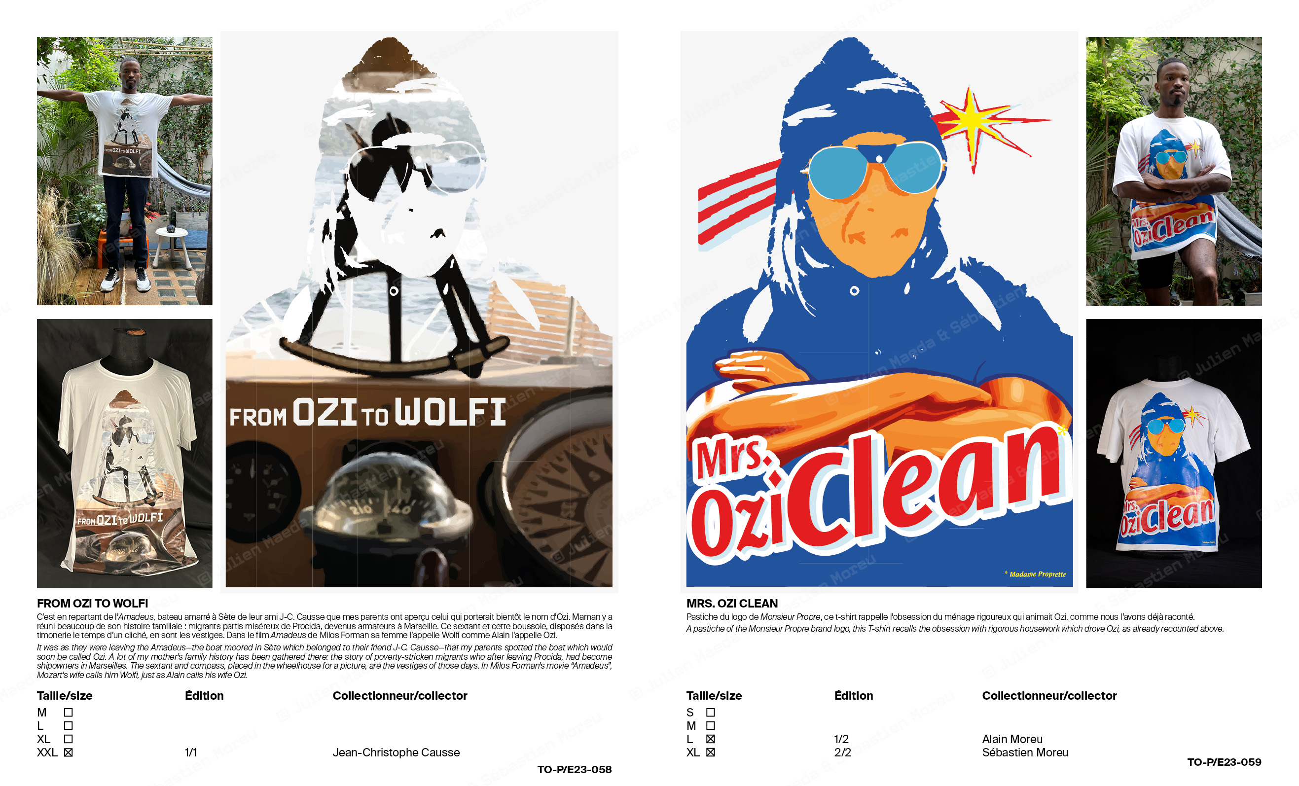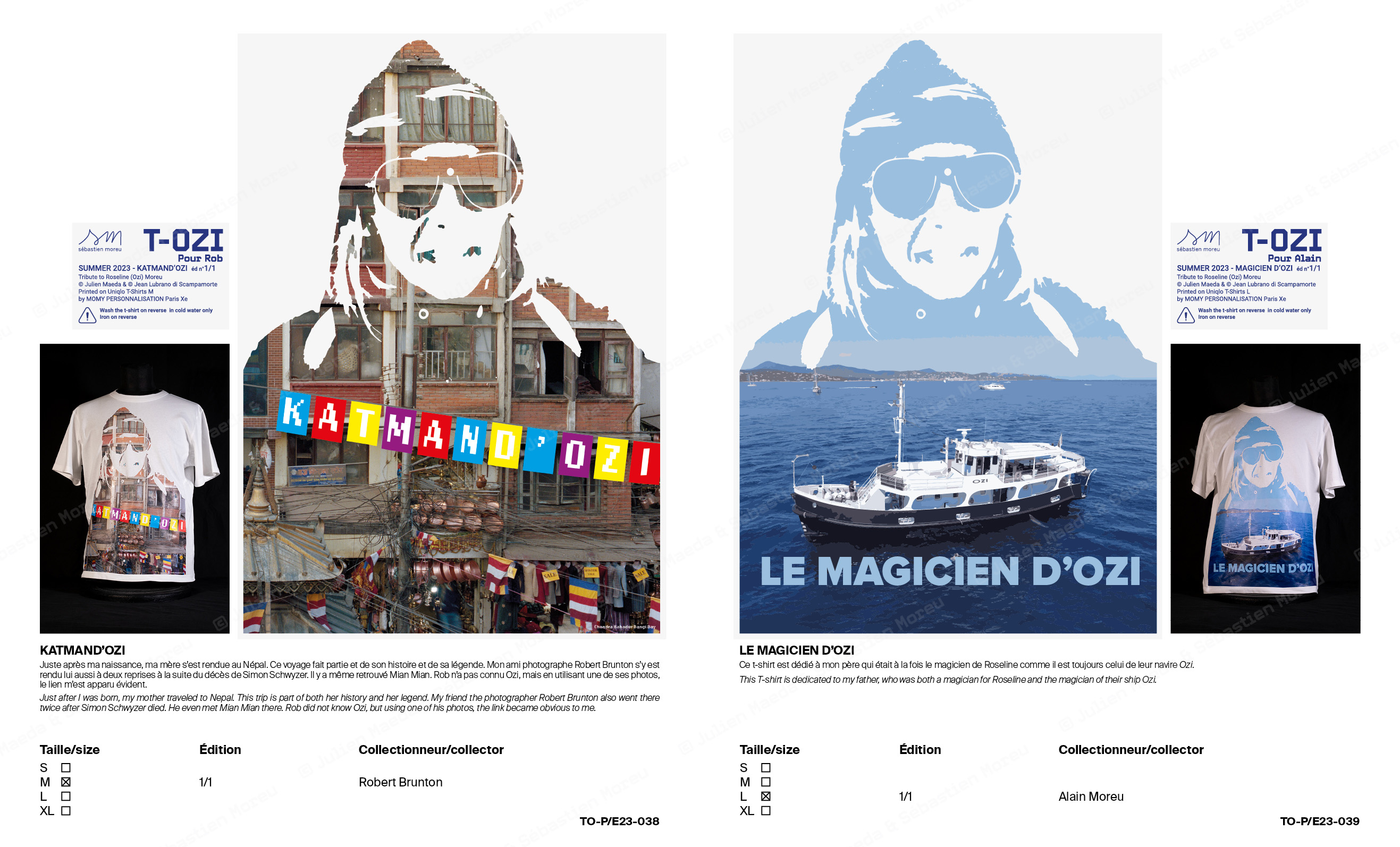 L’ouvrage T-OZI® COLLECTION de 68 pages documente et prolonge le concept en se présentant sous la forme d’un catalogue de représentant de commerce d’une marque de prêt-à-porter, qui bien que déposée est totalement fictionnelle. Des notices expliquant chacune des variations ainsi qu’un texte de Sébastien Moreu ponctuent les reproductions et prises de vue.